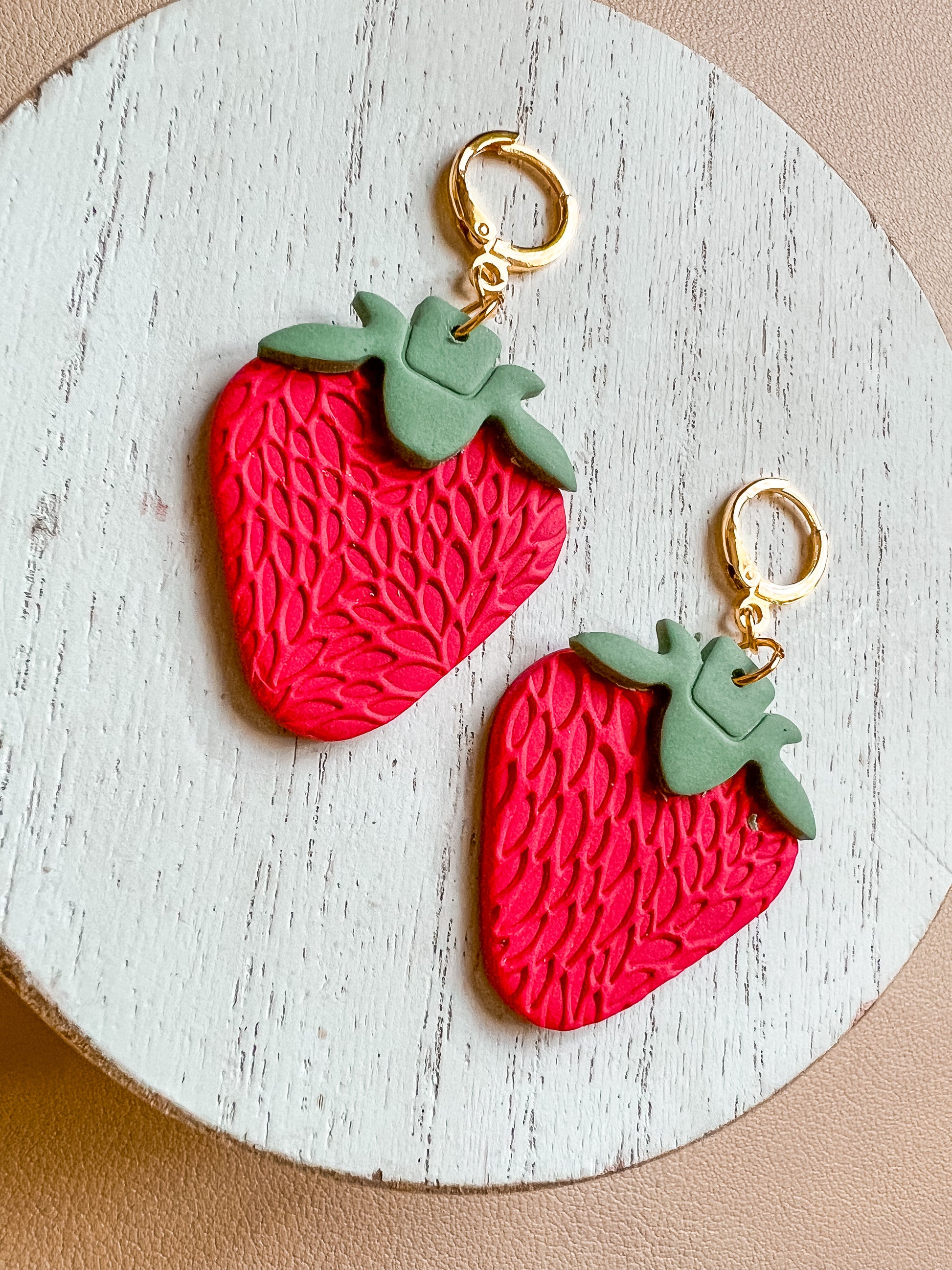 Crafted with care and attention to detail, these earrings showcase the artisan's skill and creativity. The polymer clay is carefully shaped, textured, and hand-crafted to resemble realistic strawberries. Hung on high-quality gold-plated earring hooks, these delightful accessories are sure to become a favorite in your jewelry collection.